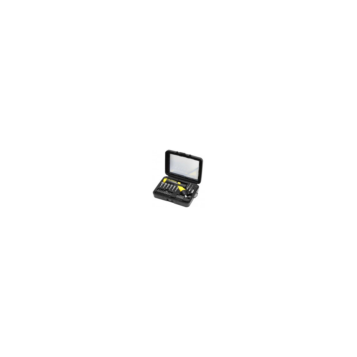 Composition : 1 rallonge 60 mm, 2 embouts 50 mm : plat 6 et Ph2, 15 embouts 25 mm : plats 5 / 6 / 7 / Ph1 / Ph2 / Pz1 / Pz2 / Hex 3 / 4 / 5 / Torx T10 / T15 / T20 / carré S1 / S2, et 6 embouts à douille 5 / 6 / 8 / 9 / 10 / 11 mm.