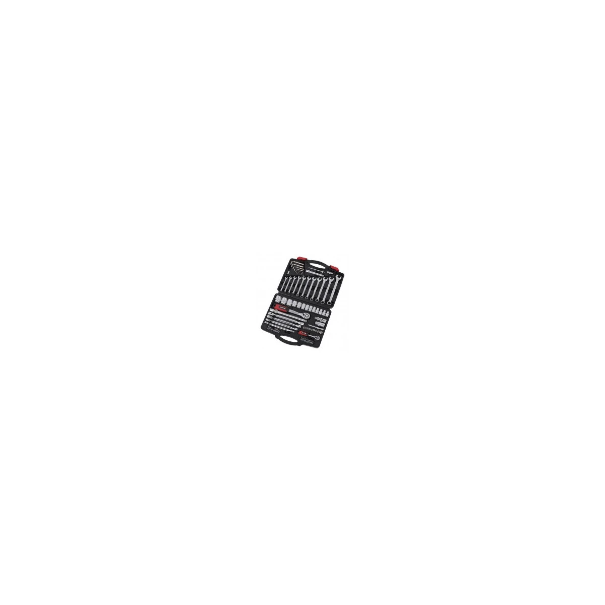 1/2″ : 1 cliquet réversible poignée bi-matière 72 dents, 13 douilles 10 à 32 mm, 1 douille à bougie 21 mm, 2 rallonges 125 et 150 mm, 1 cardan et 1 adaptateur 3 voies.