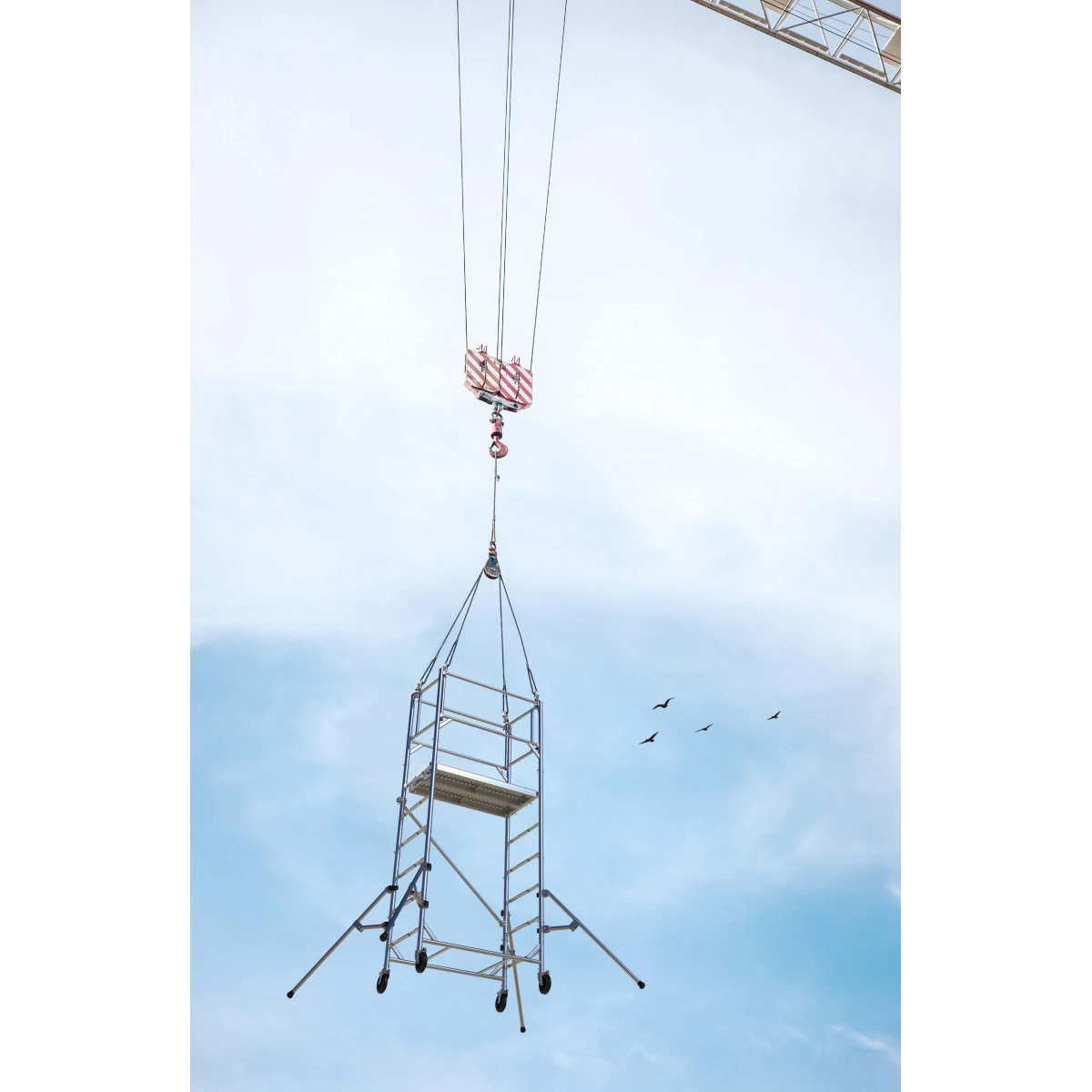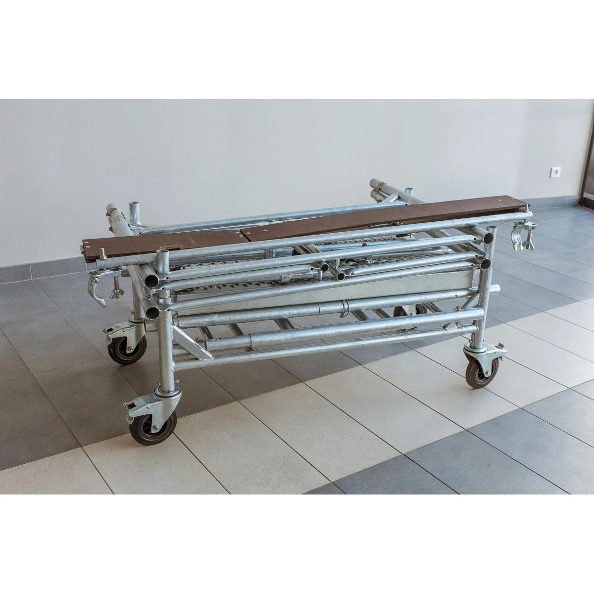 Sa structure est composée de montants de diamètre 45 mm. Il dispose d’un double plancher en acier, de 2 garde-corps anti chute.