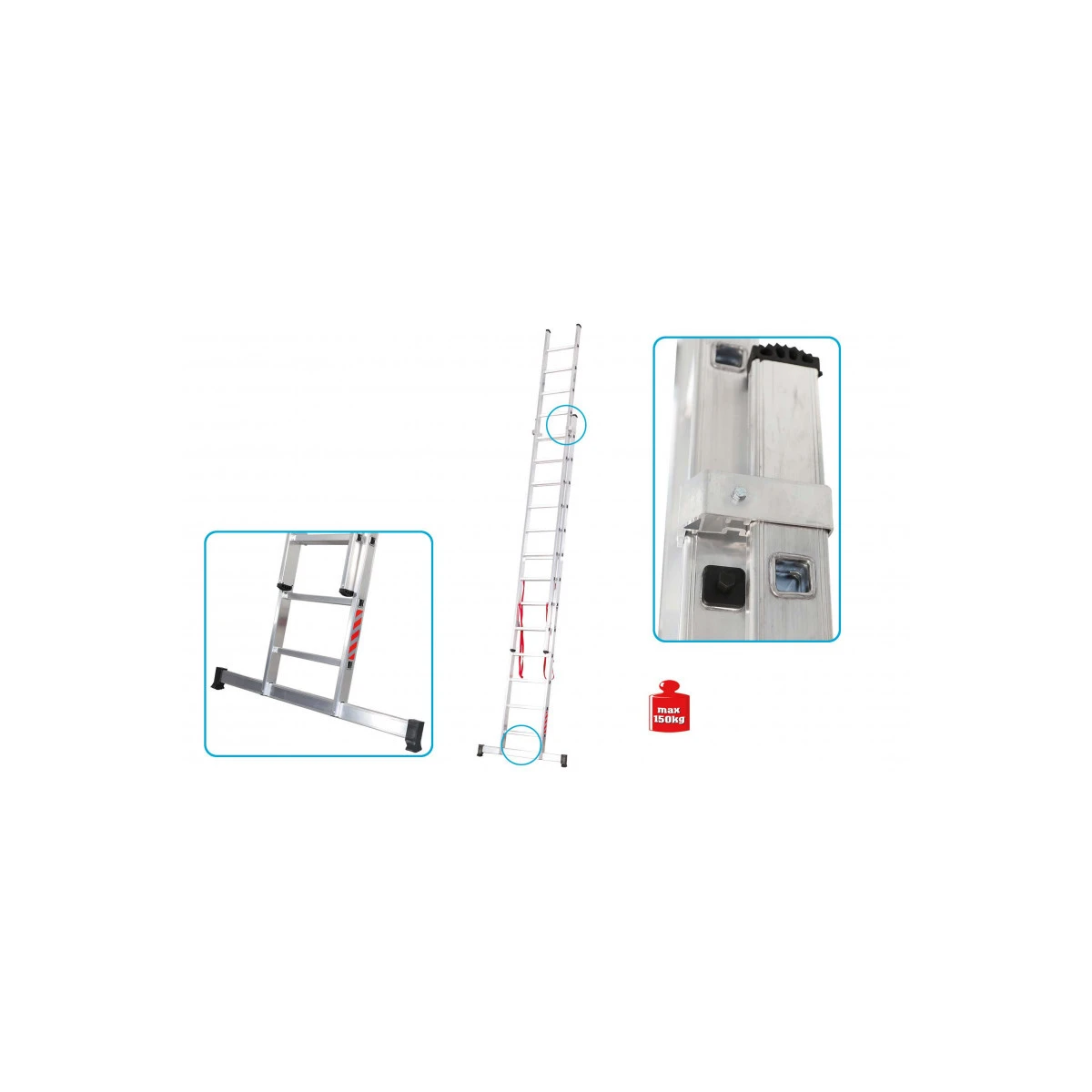 Cette échelle en aluminium est conçue pour un usage professionnel. Elle dispose de sangles anti écartement et d’une barre stabilisatrice (avec patins antidérapants) pour plus de sécurité.