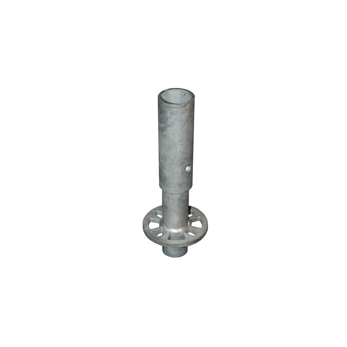 L’embase de départ pour échafaudage multidirectionnel se fixe sur le socle et est équipée d’une rosace à 8 trous permettant de fixer une moise de jonction dans n’importe quelle direction.