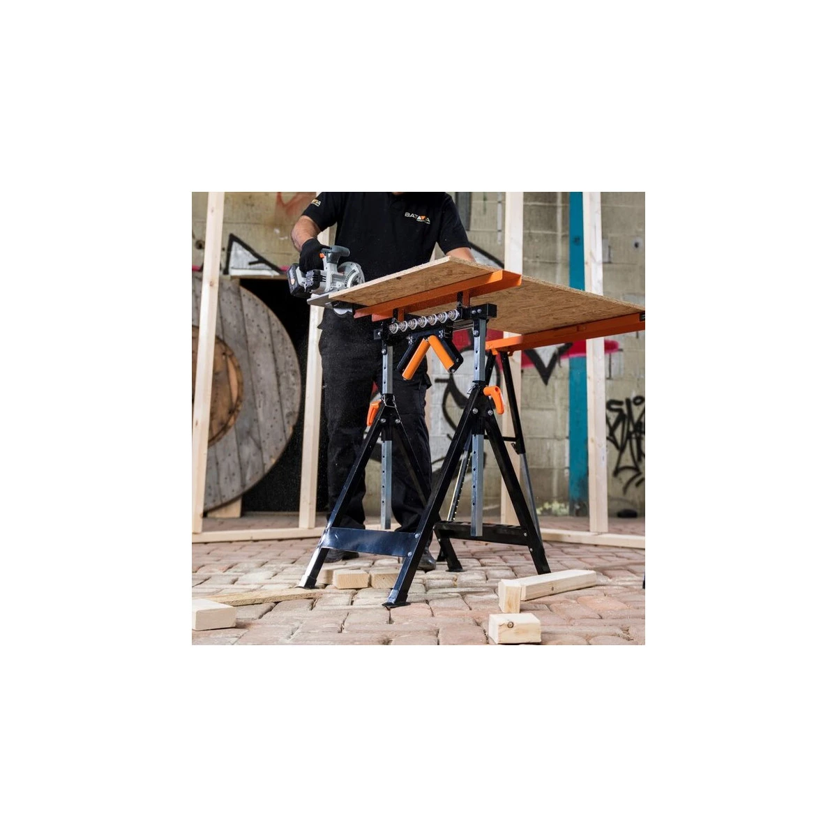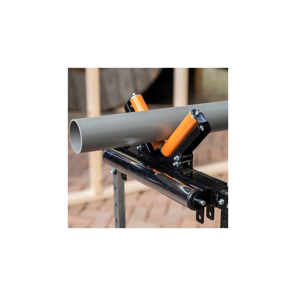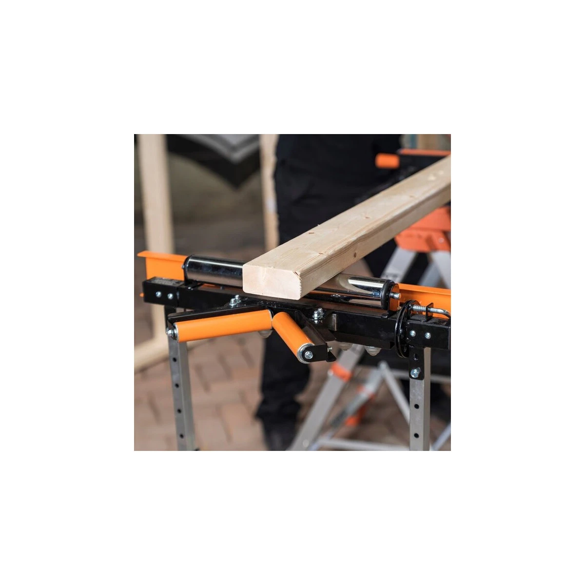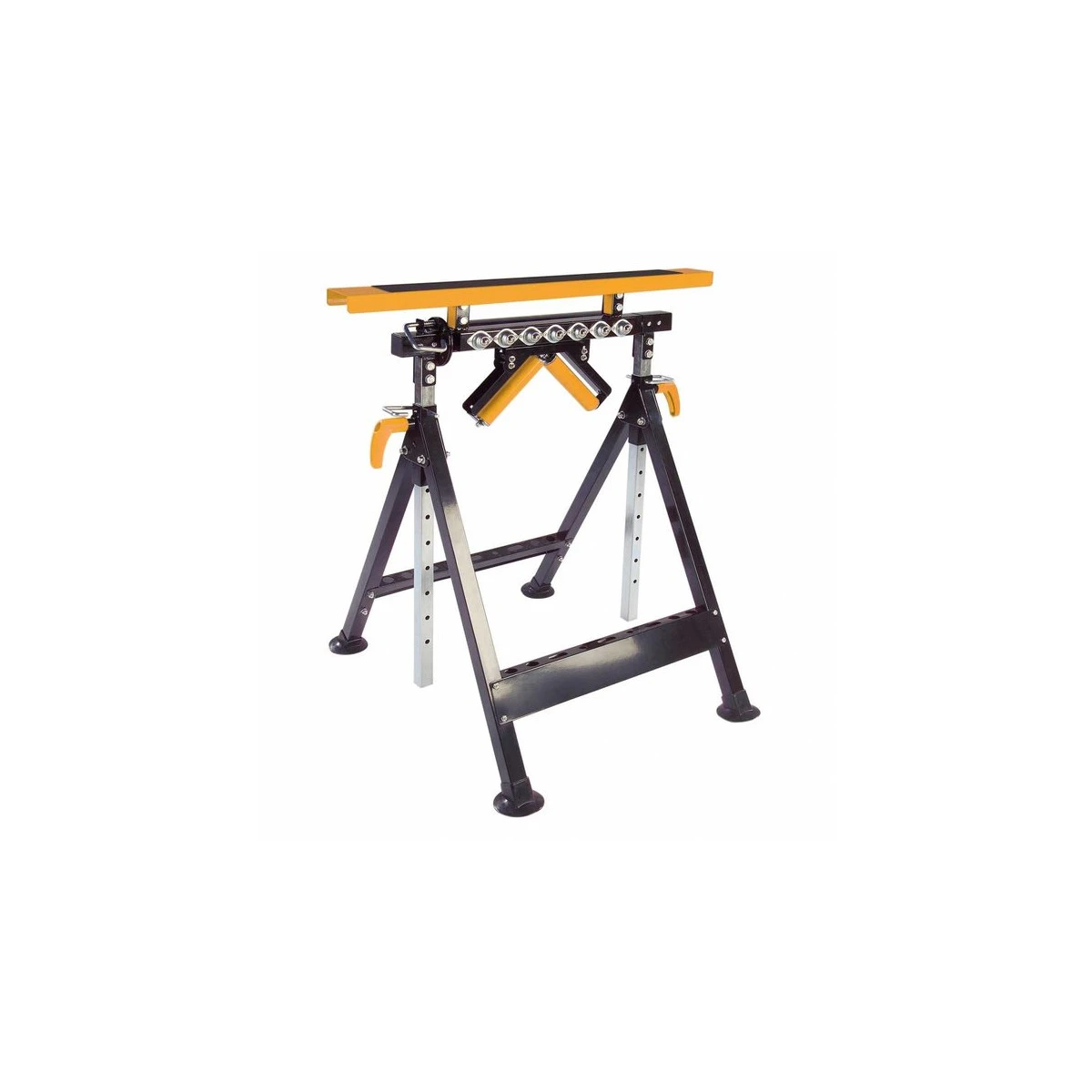 4 fonctions : Support plat permettant un usage standard, support à rouleau pour faire glisser les matériaux (s’utilise avec une scie sur table), support à 2 rouleaux en « V » pour centrer et guider des matériaux ronds, support à billes pour un mouvement multidirectionnel. Hauteur réglable de 83 cm à 128 cm.